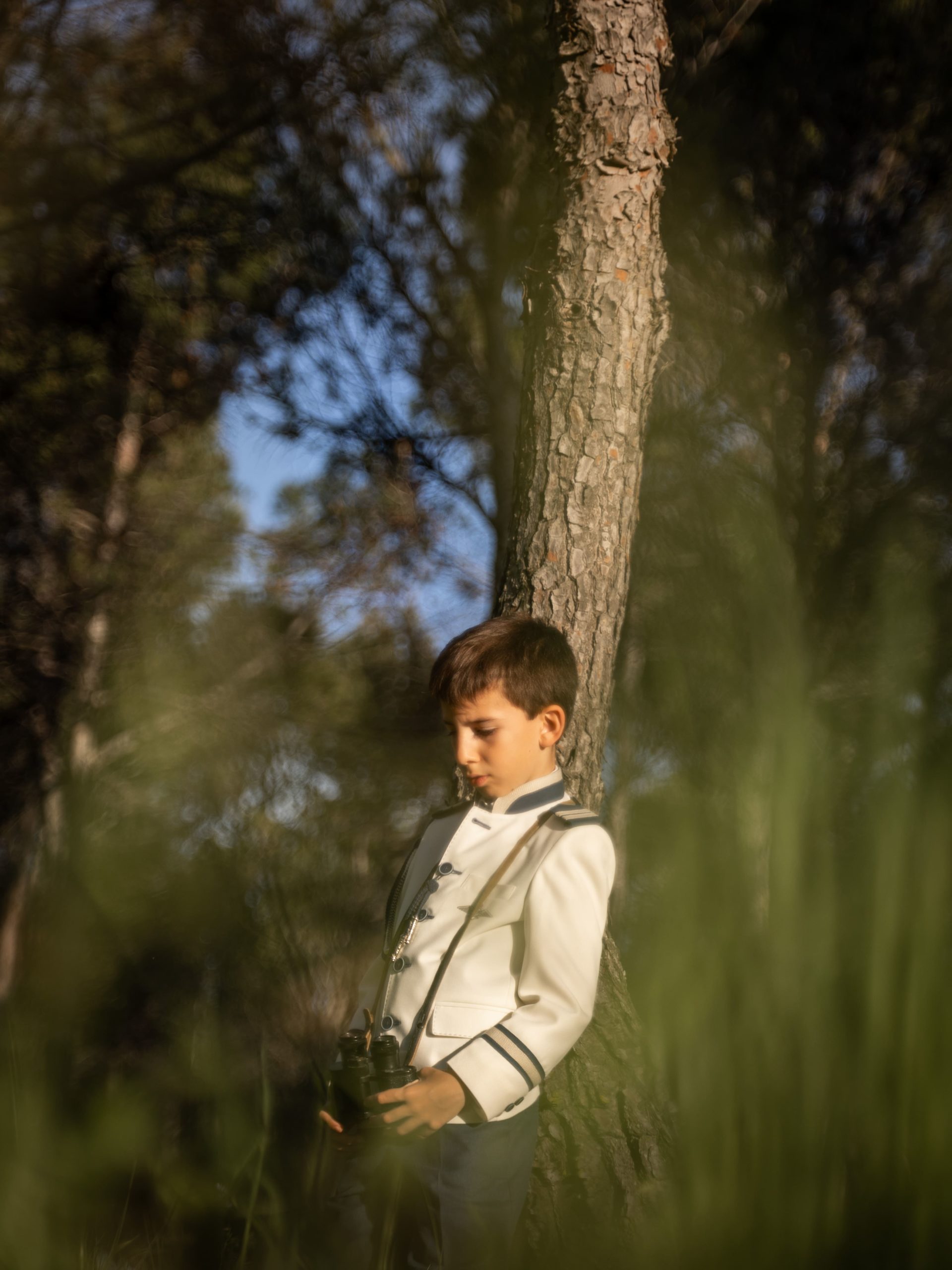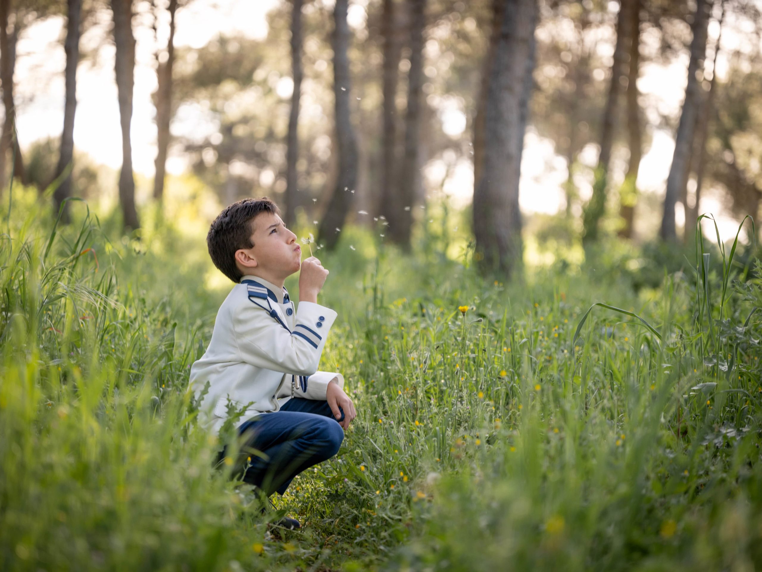 Las fotos de primera comunión en exterior las realizo en un parque natural: un entorno con diferentes espacios: pineda, puente, caminos… En este espacio los niños se sienten más libres que en el estudio y pueden expresar su forma de ser. Es una buena opción para niños algo más vergonzosos.